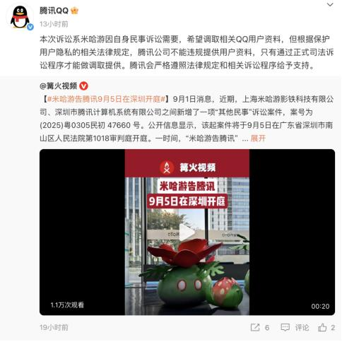 针对这一诉讼,腾讯在 9 月 1 日晚间转发了相关微博并作出回应:“此次诉讼,实际是米哈游出于自身民事诉讼的需求,希望调取相关 QQ 用户的资料。但依据保护用户隐私的相关法律规定,腾讯公司不能违规提供用户资料,只有通过正式的司法诉讼程序,才能进行调取和提供。腾讯会严格遵照法律规定以及相关诉讼程序提供支持。”