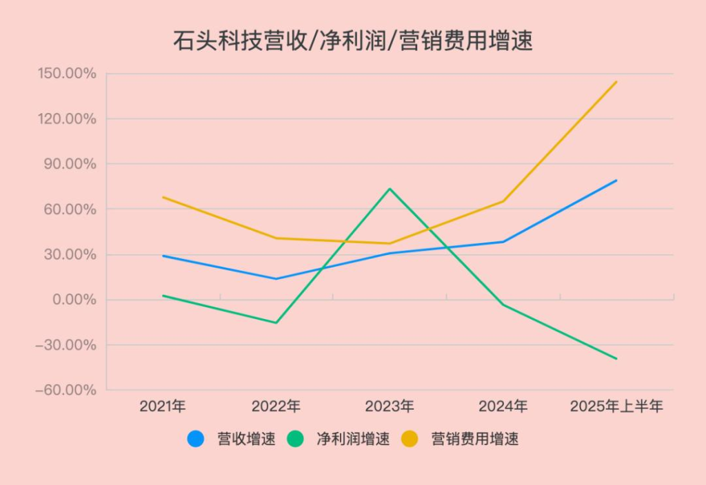 Tech 星球统计发现,从 2022 年、2024 年和今年上半年,石头科技的净利润增速一直为负数。除去 2023 年,石头科技的营销费用增速始终大于营收和利润增速,今年上半年其营销费用增速达到了 144.51%,而净利润增速则为 – 39.55%。