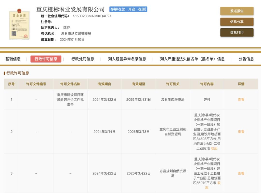 时代周报记者注意到,重庆橙标同样位于忠县,是一家柑橘类种植公司。据国家企业信用信息公示系统信息,重庆橙标拥有重庆 (忠县) 现代农业柑橘产业园项目,获重庆市忠县规划和自然资源局核发建设用地规划许可证。产业园位于忠县磨子产业园,建设用地总面积 84508 平方米。