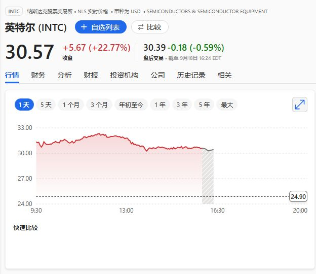 芯片板块成为领涨主力:费城半导体指数反弹超3%,英特尔以22.77%涨幅领跑成分股,英伟达也上涨3.49%。英特尔市值一日增长超270亿美元,英伟达市值增加逾750亿美元,两家公司市值合计增长超过1000亿美元(约7200亿元人民币)。彭博数据显示,英特尔市盈率升至57倍(基于12个月预期收益),创2001年以来新高。