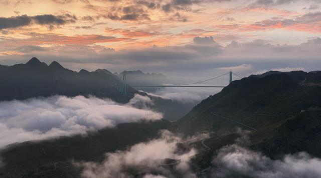 云雾中的花江峡谷大桥呈现出一种近乎超现实的美学奇观。晨光暮色中,钢铁结构与流动的云海形成刚柔并济的视觉交响。桥体在云雾中若隐若现,时而如游龙穿行,时而似天梯垂落,这种动态的美学体验恰恰隐喻了桥梁的本质——连接与流动。当霞光为桥体镀上金边,人类工程奇迹与自然鬼斧神工达成了罕见的和谐共鸣。这种美学价值绝非偶然,而是中国桥梁建设者将功能性与艺术性完美结合的明证。