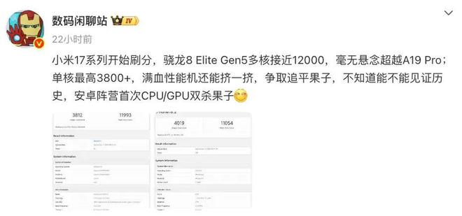 根据数码博主@数码闲聊站 的最新爆料,小米17系列正在进行的性能测试中表现出色。搭载高通第五代骁龙8至尊版移动平台(骁龙8 Elite Gen5)的小米17系列,在多核测试中得分接近12000分,这一成绩已经毫无疑问地超越了苹果A19 Pro芯片。