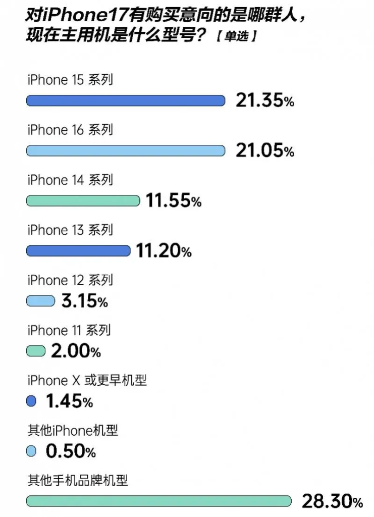 - 理性观望党:建议这类用户(约占40.5%)可等待双十一大促,但需合理管理预期。据分析,iPhone17标准版双十一期间可能仅降价至5499元左右,Pro系列预计降价400-800元,幅度有限。因此,标准版用户首发入手可能更划算,而Pro用户则可考虑等待双十一。