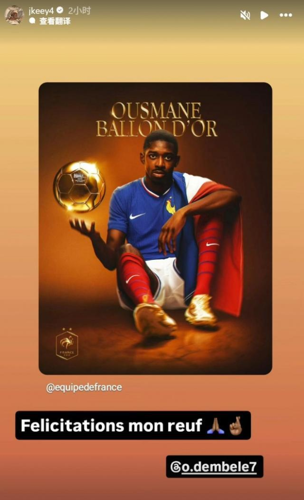 孔德,这位效力于巴塞罗那的后防悍将,与登贝莱在法国国家队并肩作战,一同为高卢雄鸡的荣耀而战。他们在训练场上一同挥洒汗水,在比赛中相互信任、默契配合,共同经历了无数的胜利与挑战,深厚的兄弟情谊在时光的磨砺中愈发坚固。当得知登贝莱荣获金球奖的喜讯后,孔德第一时间在社交媒体上晒出了登贝莱身穿法国国家队球衣的照片。照片中的登贝莱,眼神坚定而炽热,仿佛在诉说着他对足球的无限热爱与执着追求。孔德在照片旁配文写道:“恭喜我的兄弟登贝莱。” 这简短的几个字,却饱含着孔德对登贝莱的深深祝福与无尽骄傲。仅仅一句话,却将他们之间深厚的兄弟情展现得淋漓尽致,也让广大球迷们感受到了足球场上那份纯粹而真挚的情谊。