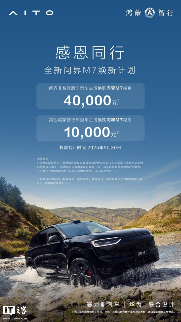焕新计划的核心权益极具吸引力:问界非辅助驾驶版首任车主增换购可享 40000 元减免,鸿蒙智行旗下其他系列车主增换购则享受 10000 元尾款减免,权益有效期至 2025 年 9 月 30 日。这一政策精准覆盖了两类核心人群:一类是早期购买问界非智驾版的用户,他们对品牌已有认可度,4 万元的高额减免成为其升级换代的直接动力;另一类则是鸿蒙智行生态内的忠实用户,1 万元优惠有效促进跨系列转化。