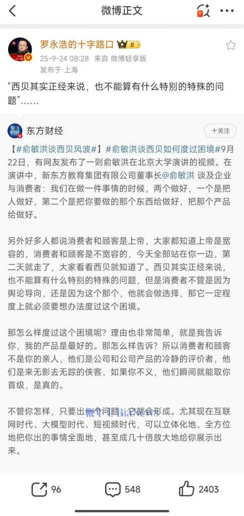 俞敏洪在北大演讲中的观点更为尖锐:“消费者今天可能支持你,第二天就会离开。”这句话道破了现代商业的残酷真相:消费者的忠诚度变得前所未有的脆弱。在社交媒体时代,一个看似微不足道的问题,可能通过短视频平台的放大,演变成一场品牌危机。