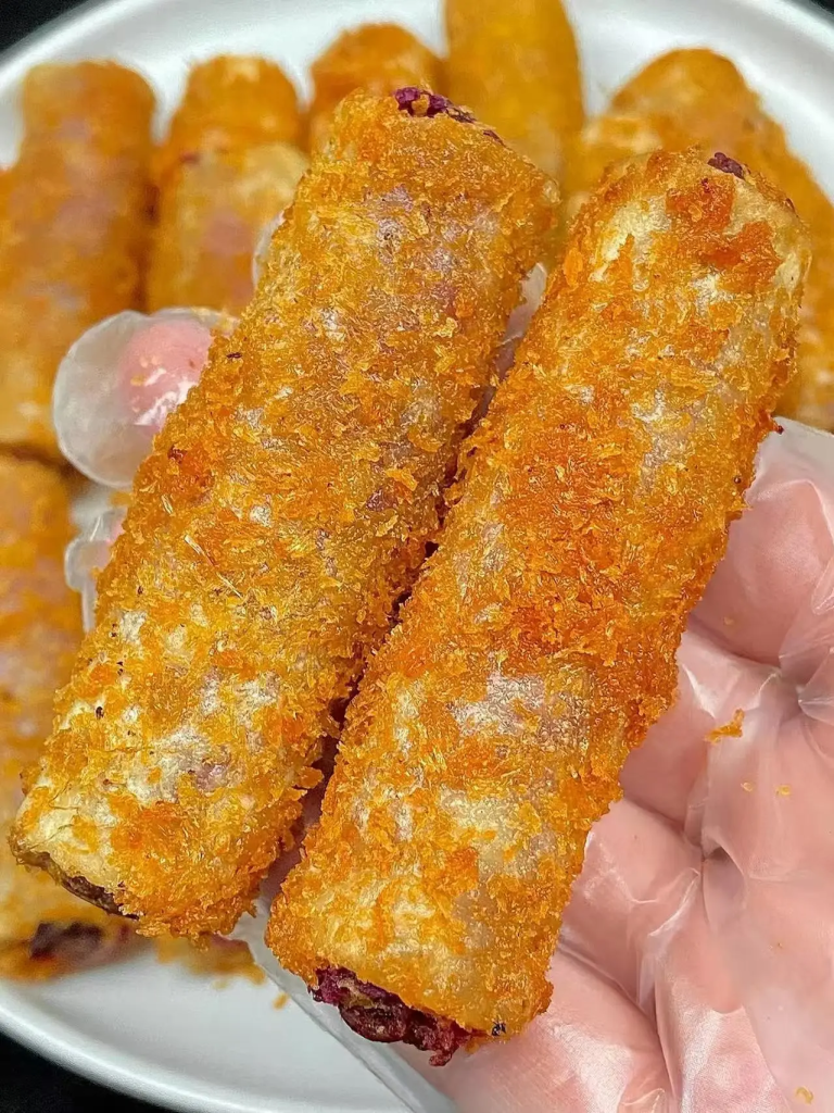 刚炸好的酥香紫薯馄饨皮,一定要趁热吃 —— 外层的面包糠金黄酥脆,咬下去 “咔嚓” 作响,碎屑会轻轻掉在手心;中间的馄饨皮吸满了油脂的香气,变得薄而脆,却不会发硬;最里面的紫薯馅温热软糯,带着淡淡的薯香,甜度刚刚好,不会齁嗓子,三者融合在一起,口感层次丰富,每一口都像在吃 “迷你版紫薯派”。