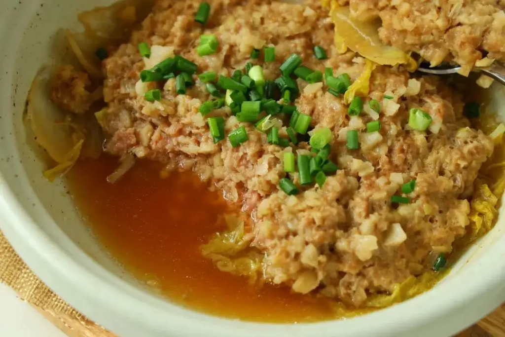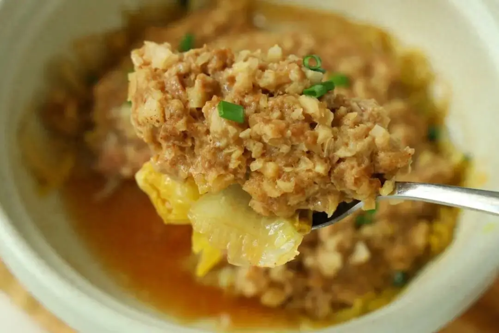 砂锅的使用是这道菜的另一精髓所在。在砂锅底部铺上一颗娃娃菜,可以稍微撕成大块,撒少许盐和生抽调个底味。砂锅的厚壁能够均匀传热,使食材从底部和四周同时受热,特别适合焖煮类菜肴。将调好的肉馅平铺在娃娃菜上,稍微压平。此时可以加入少量清水(约50毫升),以防止焖制过程中干锅。